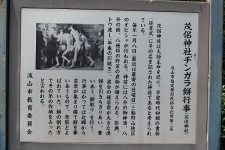 延喜式神名帳(平安初期に作られた法令集)にのっている式内社で大和国城山郡三輪野山(奈良県)の麓に祭礼し大物主命の分霊を祭っています。毎年1月8日には、茂侶神社の「ヂンガラ餅の神事」(氏子が総出で茂侶神社に参拝して八升の鏡餅(上が三升、下が五升)、8種類の野菜の煮物をお供えした後、参拝者全員で食べるため、8づくしがモットーとなっています)があります。この行事は流山市指定無形民俗文化財に指定されています。祭 神 大物主命(オオモノヌシノミコト)縁 起 下毛野君の始祖豊城命が茂侶神社と名付けたと言われる。貞観2年(860)、三輪神社唱える。大正7年(1919)、茂侶神社に改称御朱印 江戸時代に寺領25石を拝領市指定無形民俗文化財 ヂンガラ餅神事石造物 庚申塔(立像、元禄4年/1691)、大国主命像(平成8年/1996)ほか万葉歌碑 高さ約1.2m、横幅約1.9m 建 立 流山市観光協会「にほとりの 東葛早稲を にへすとも そのかなしきを 外に立てめやも」※下総女の情愛の深さを見せた恋歌で、往時の民謡と考えられている。