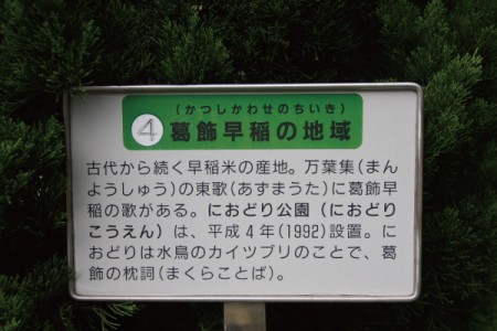 新川耕地の北端、利根運河の南隣にある工業団地の緩衝緑地として整備された公園で、古代、この地が葛飾早稲を産しており、万葉集にある葛飾早稲の歌に出てくる鳰(にほどり=カイツブリ)から公園名が命名されました。 におどり(鳰鳥)は、カイツブリという淡水に生息する水鳥の古名です。葛飾早稲発祥の地は、鎌倉時代の記録に矢木郷(流山地域)は、早稲米によって知られたところで、古歌にうたわれた葛飾の室の早稲米とはここのものであると書いてあります。三輪野山の茂侶神社に、葛飾早稲の万葉歌碑があります。 春には満開の桜や菜の花が彩り、木製アスレチック遊具やジョギングコースがあります。春には満開の桜が彩ます。